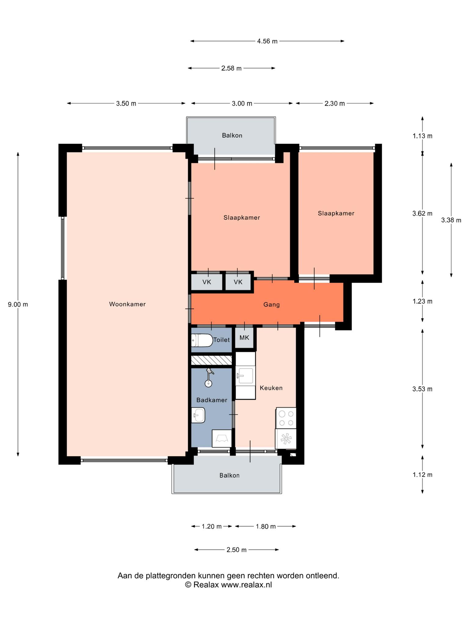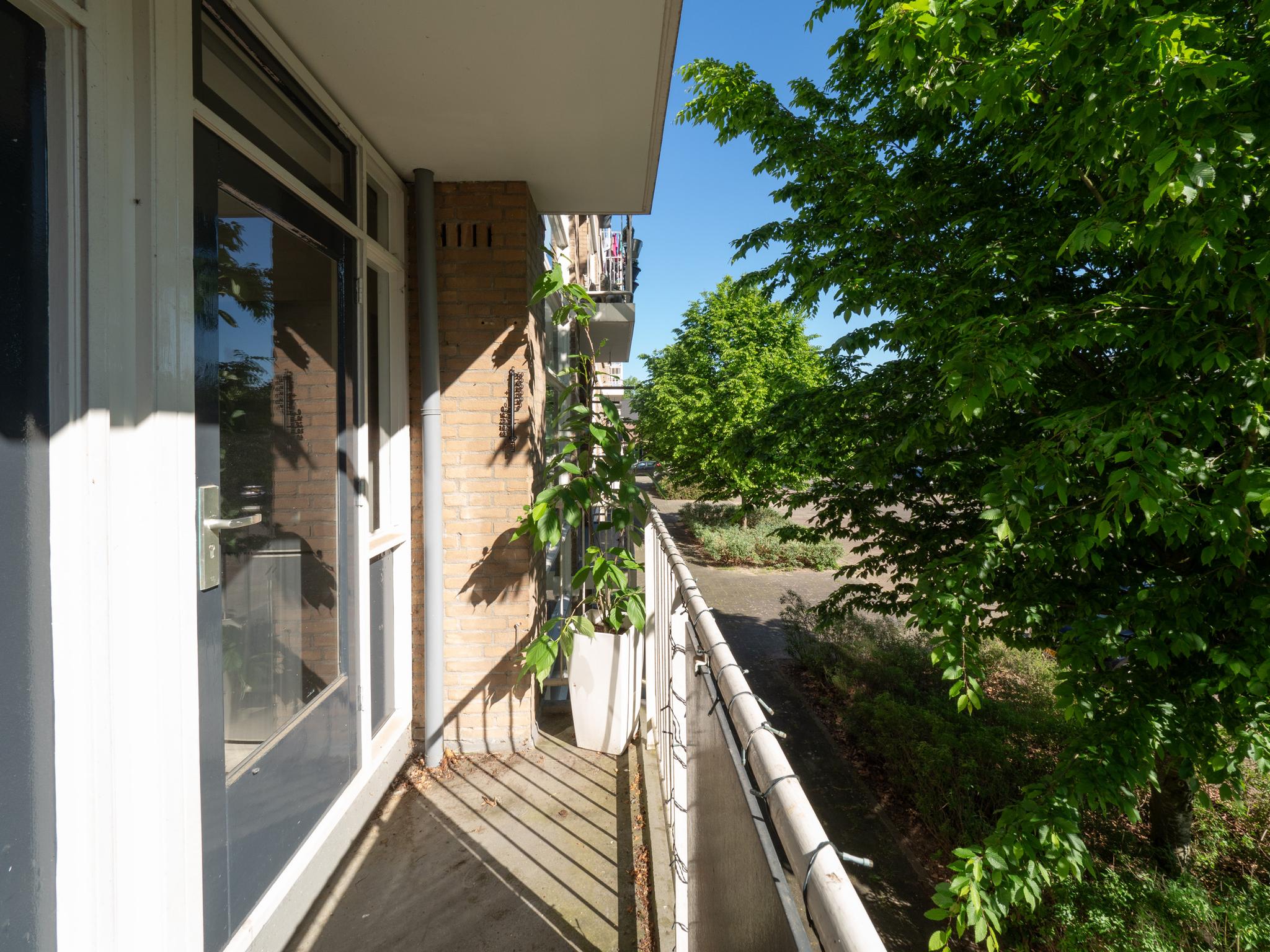 Entree, meterkast, toilet, doorzon woonkamer, 2 slaapkamers waarvan 1 met balkon,keuken met balkon, compacte badkamer.