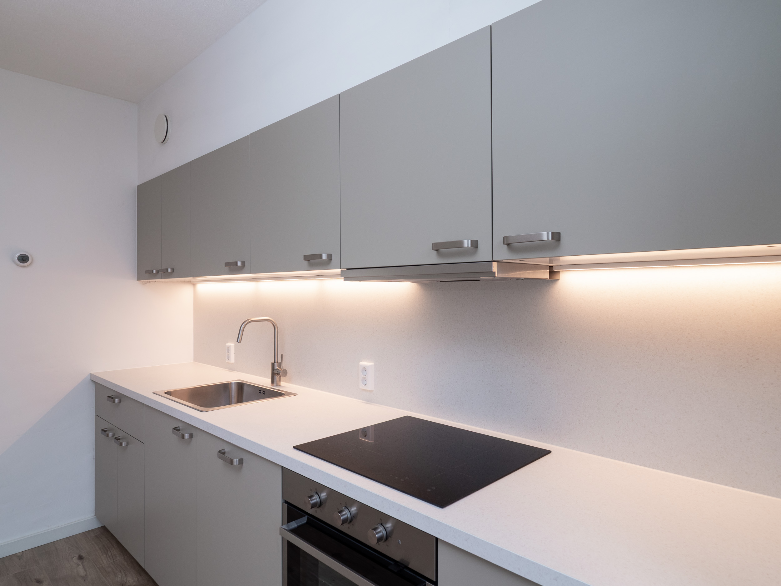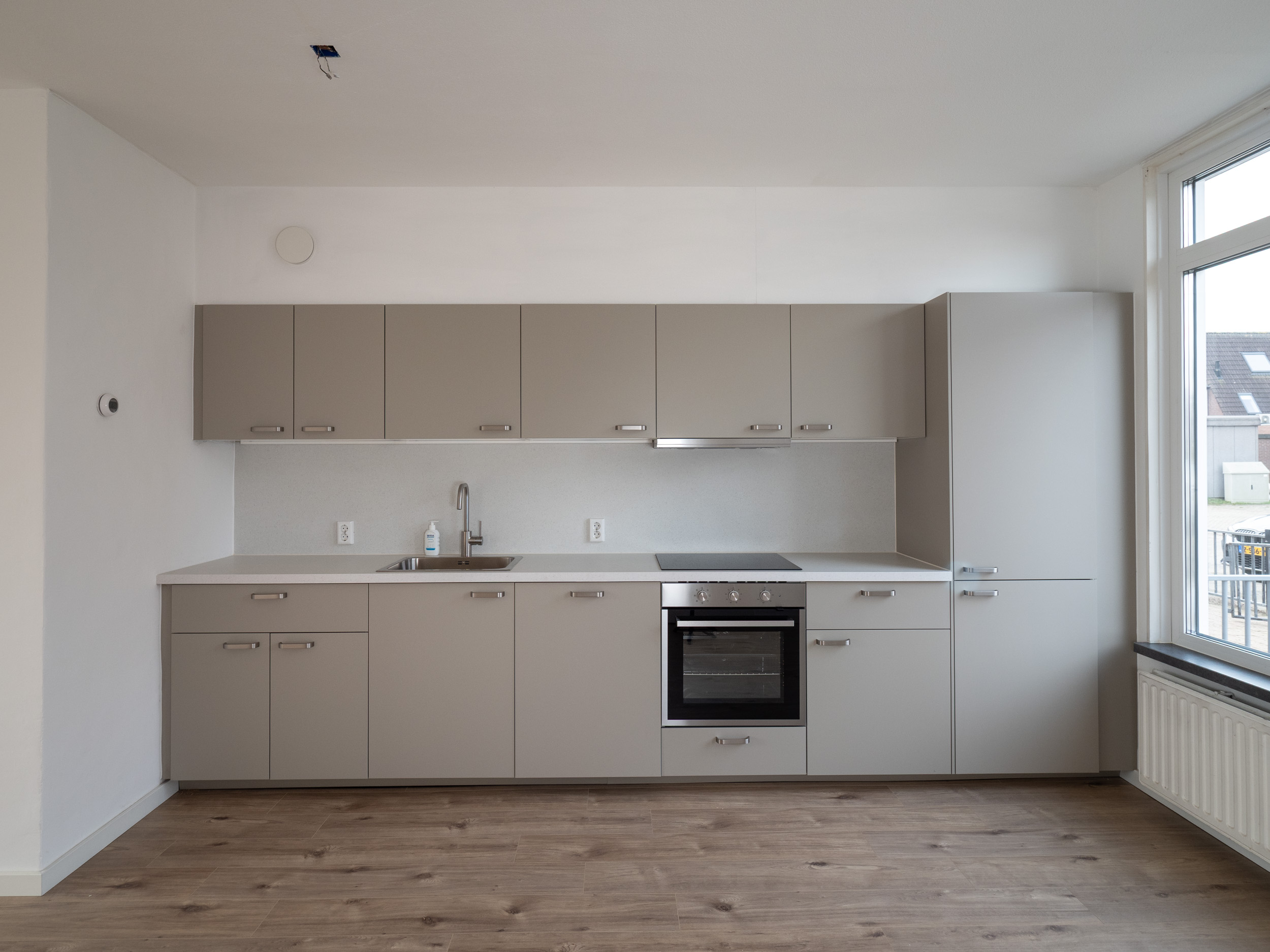 Gloednieuwe keuken uit 2026 met rechte opstelling, voorzien van koel-vries combinatie, inductiekookplaat, oven, spoelbak, vaatwasser en afzuiging.