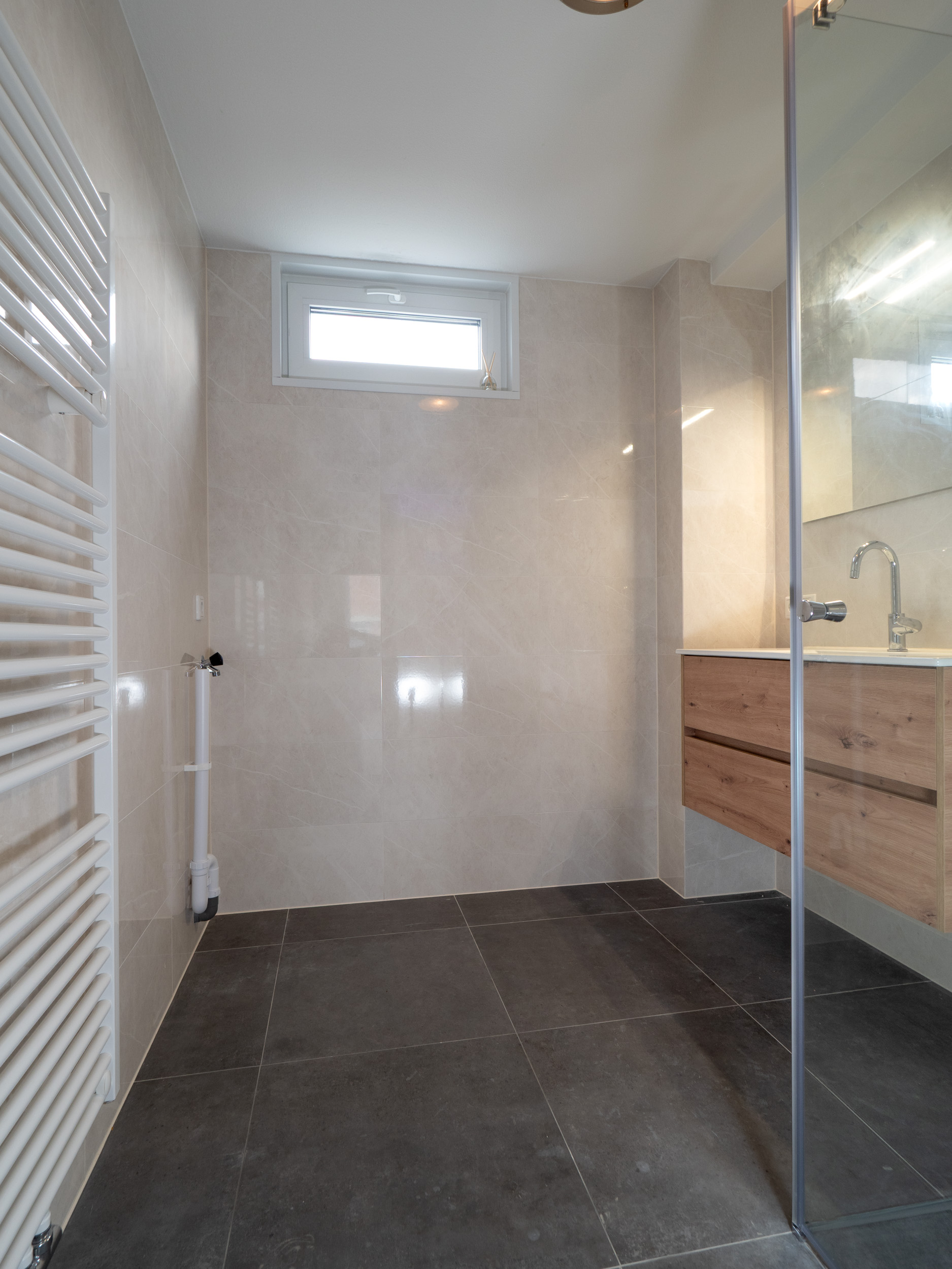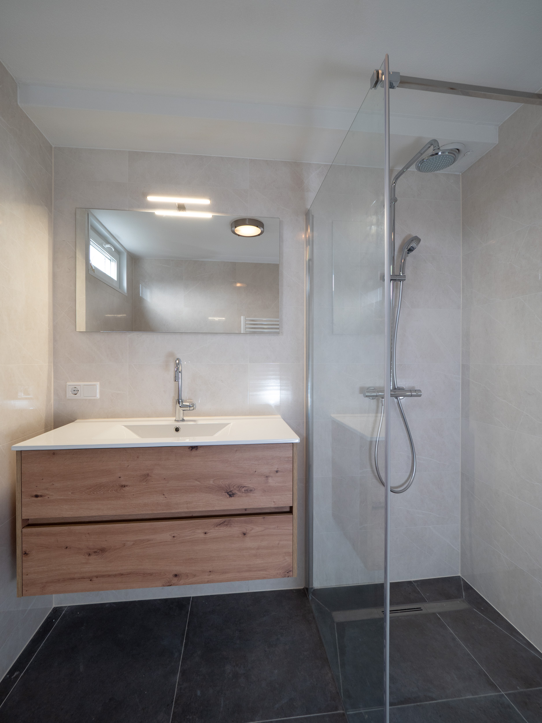 Gloednieuwe badkamer met inloopdouche, wastafelmeubel en witgoedaansluiting (2026).