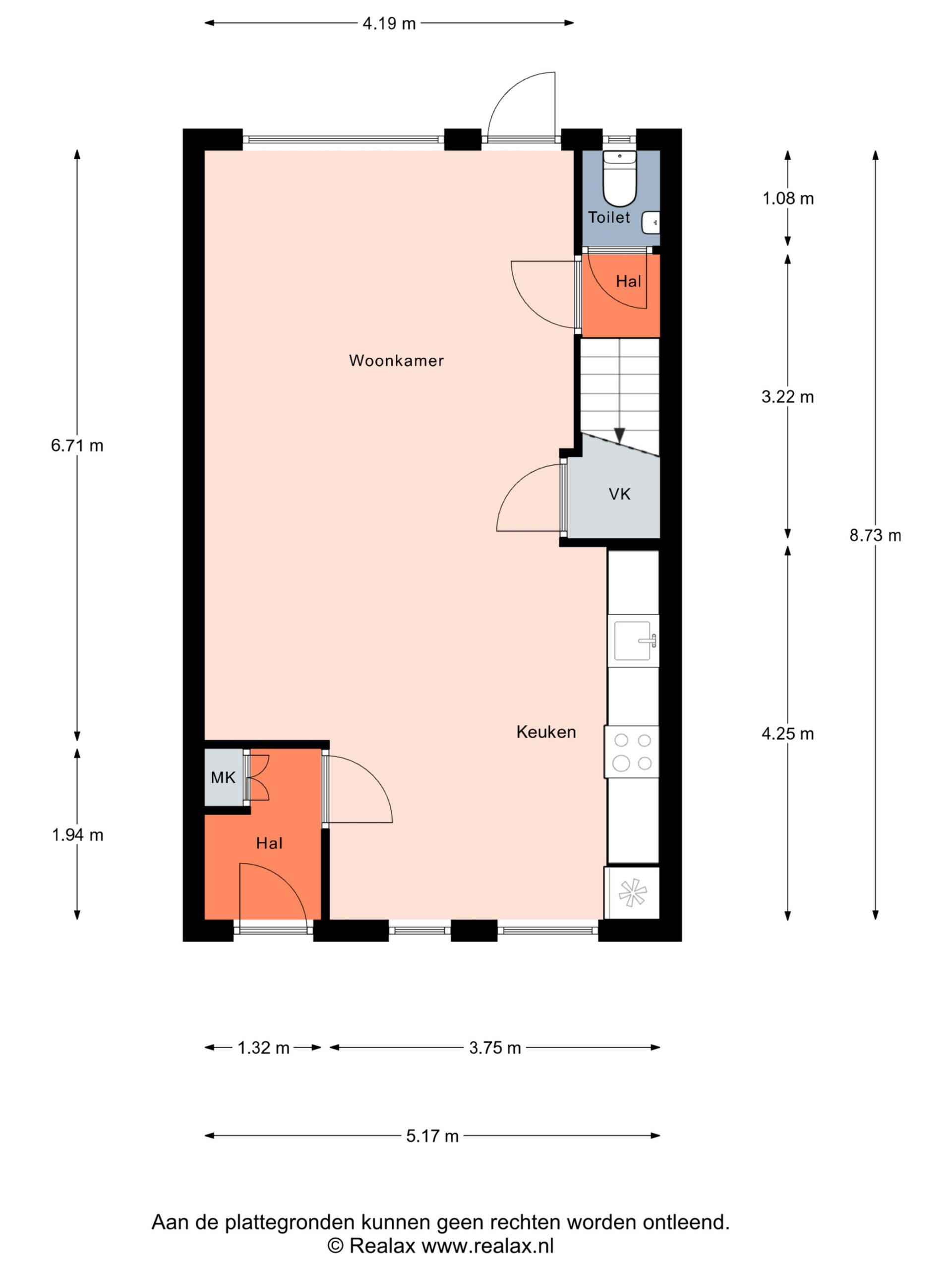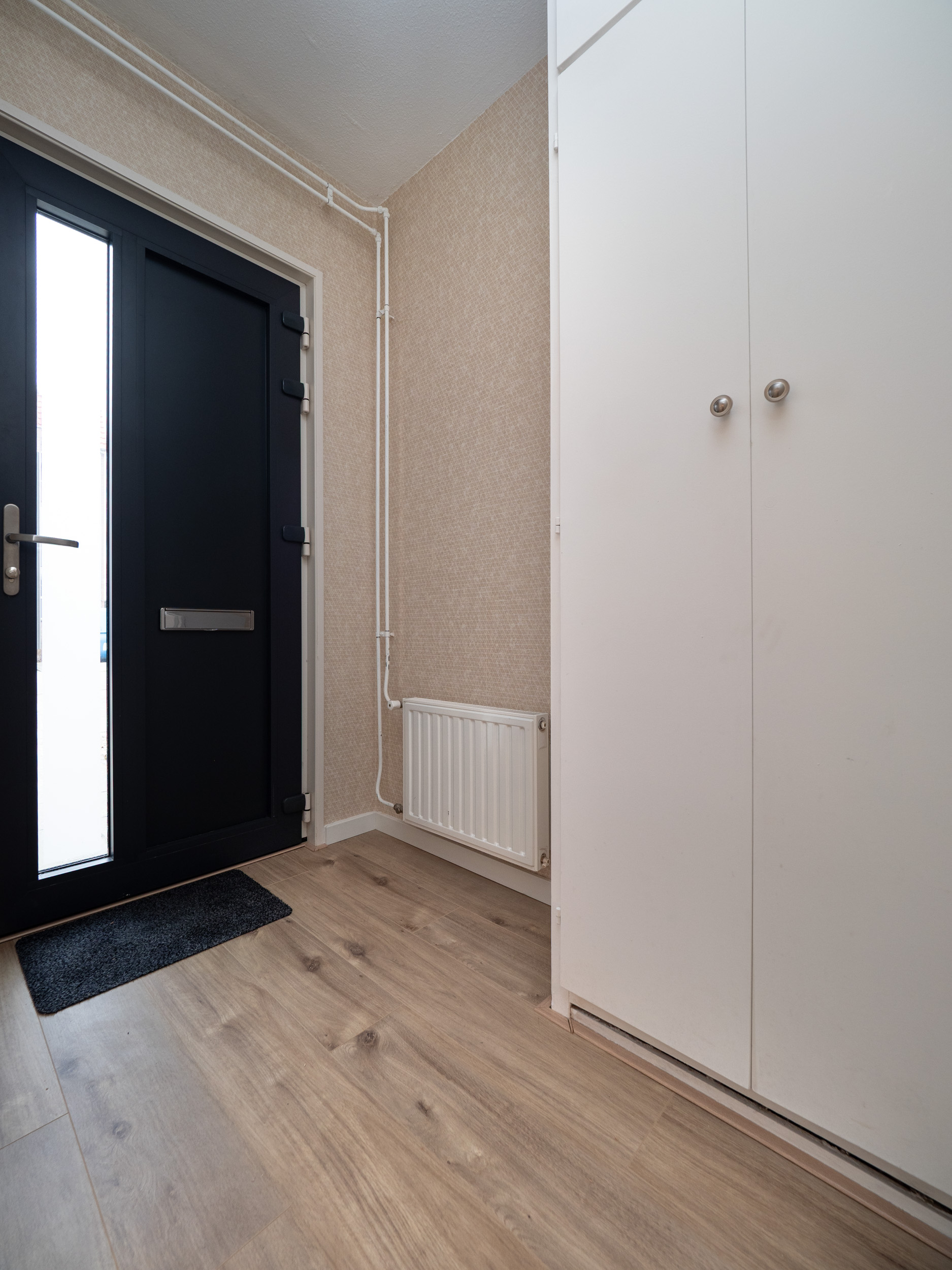 Hal met meterkast, woonkamer, open keuken, opbergkast, toilet en trap naar boven.