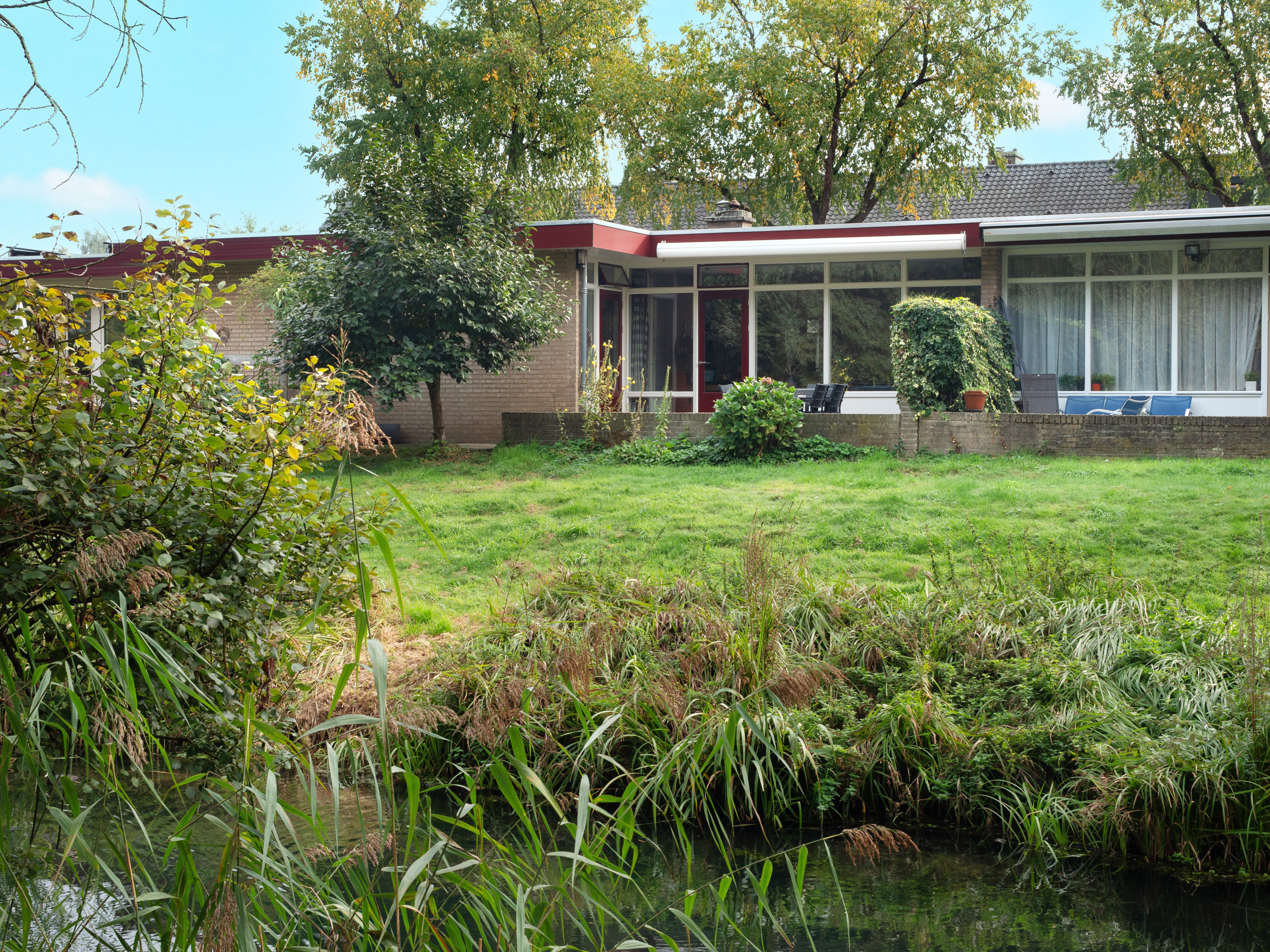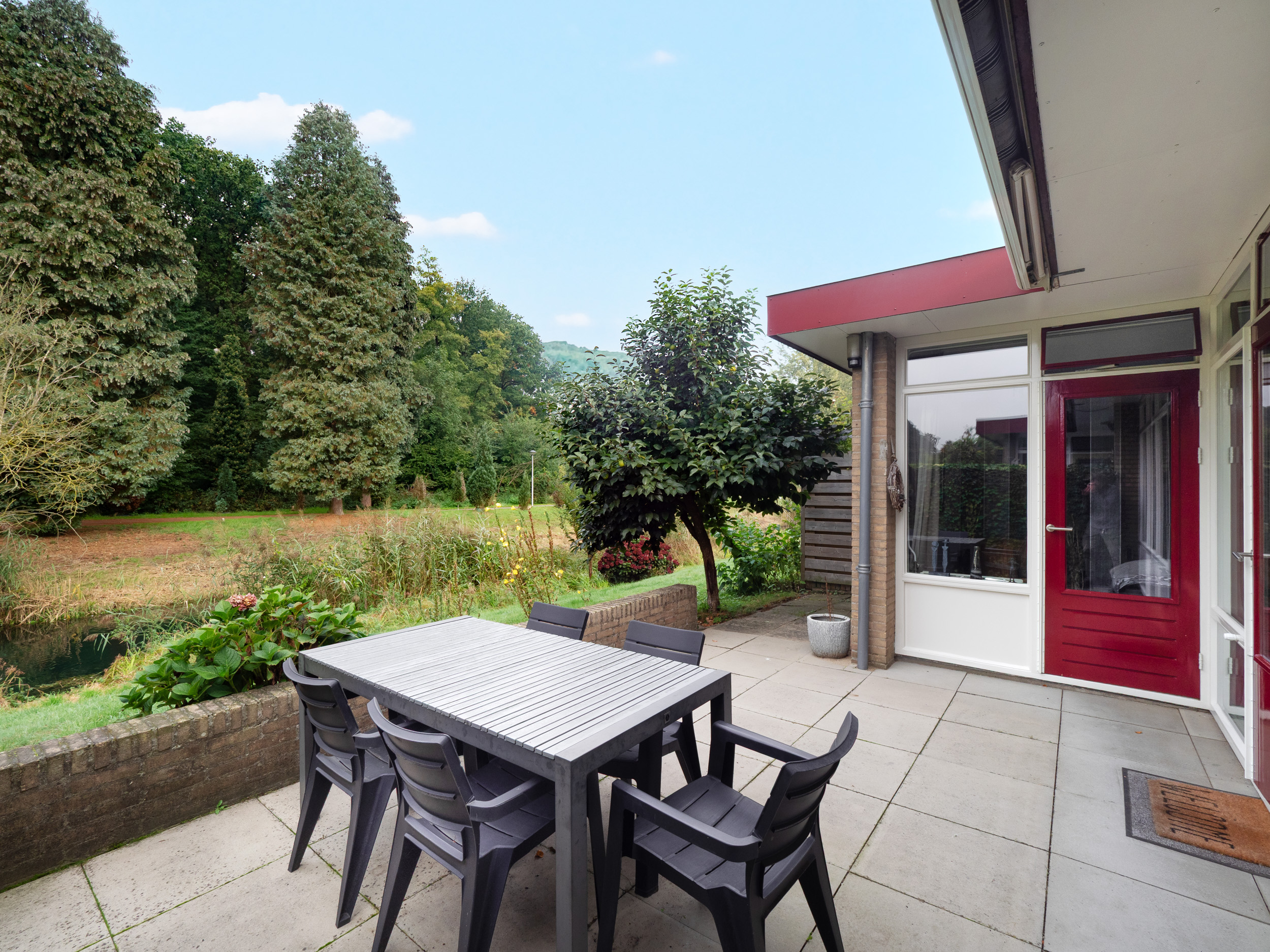 Aan de achterzijde een terras grenzend aan een afgesloten gemeentelijk grasperk en waterpartij en aansluitend het “Uilenbosje” .