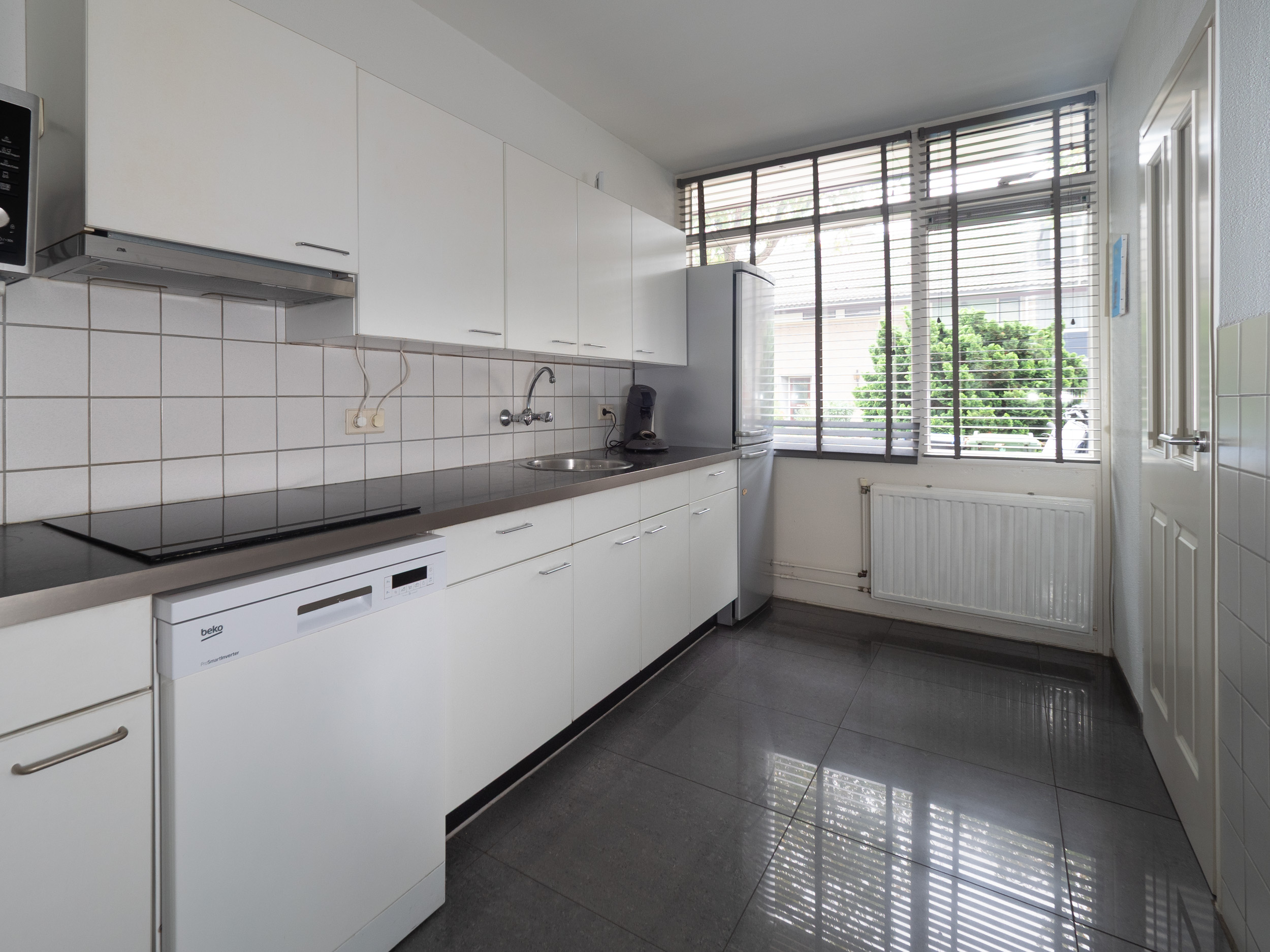 Gesloten keuken met rechte opstelling en voorzien van een inductiekookplaat, vaatwasser, magnetron en koel-vriescombinatie.