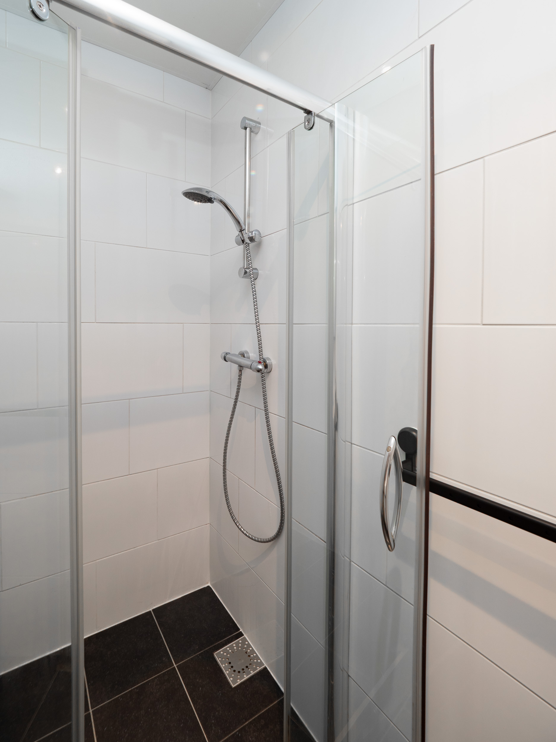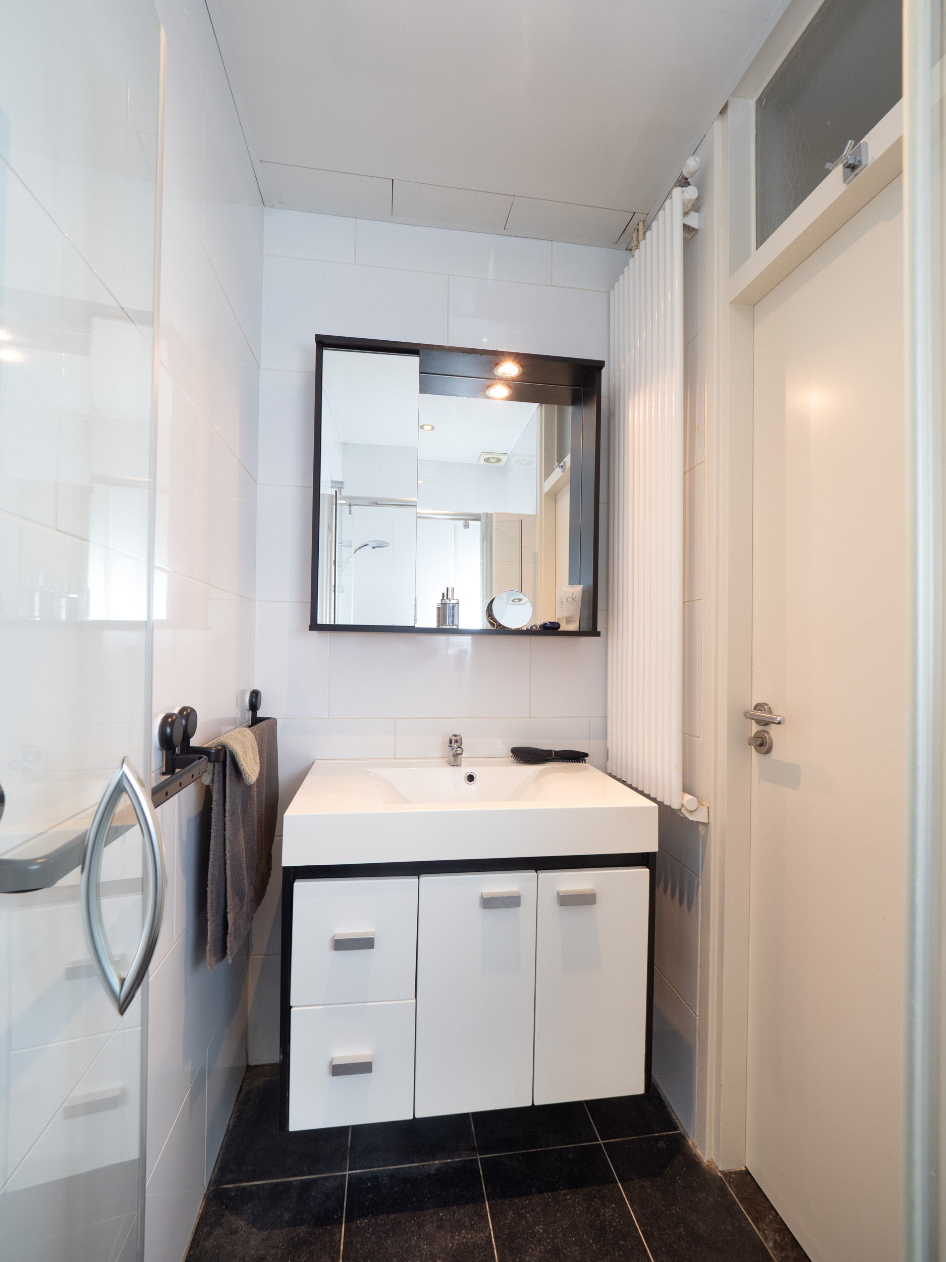 Compacte badkamer met douche en wastafelmeubel op de begane grond.