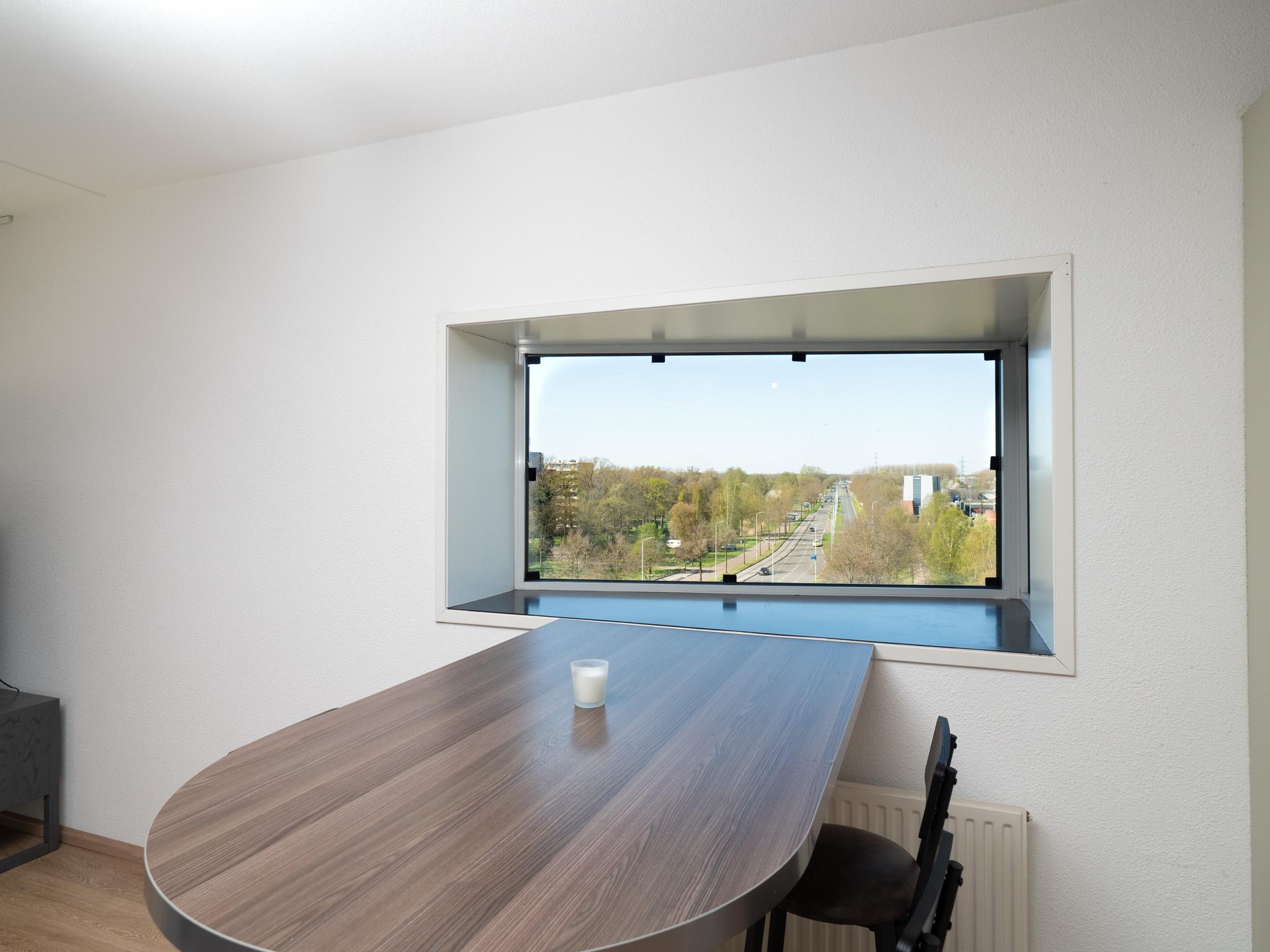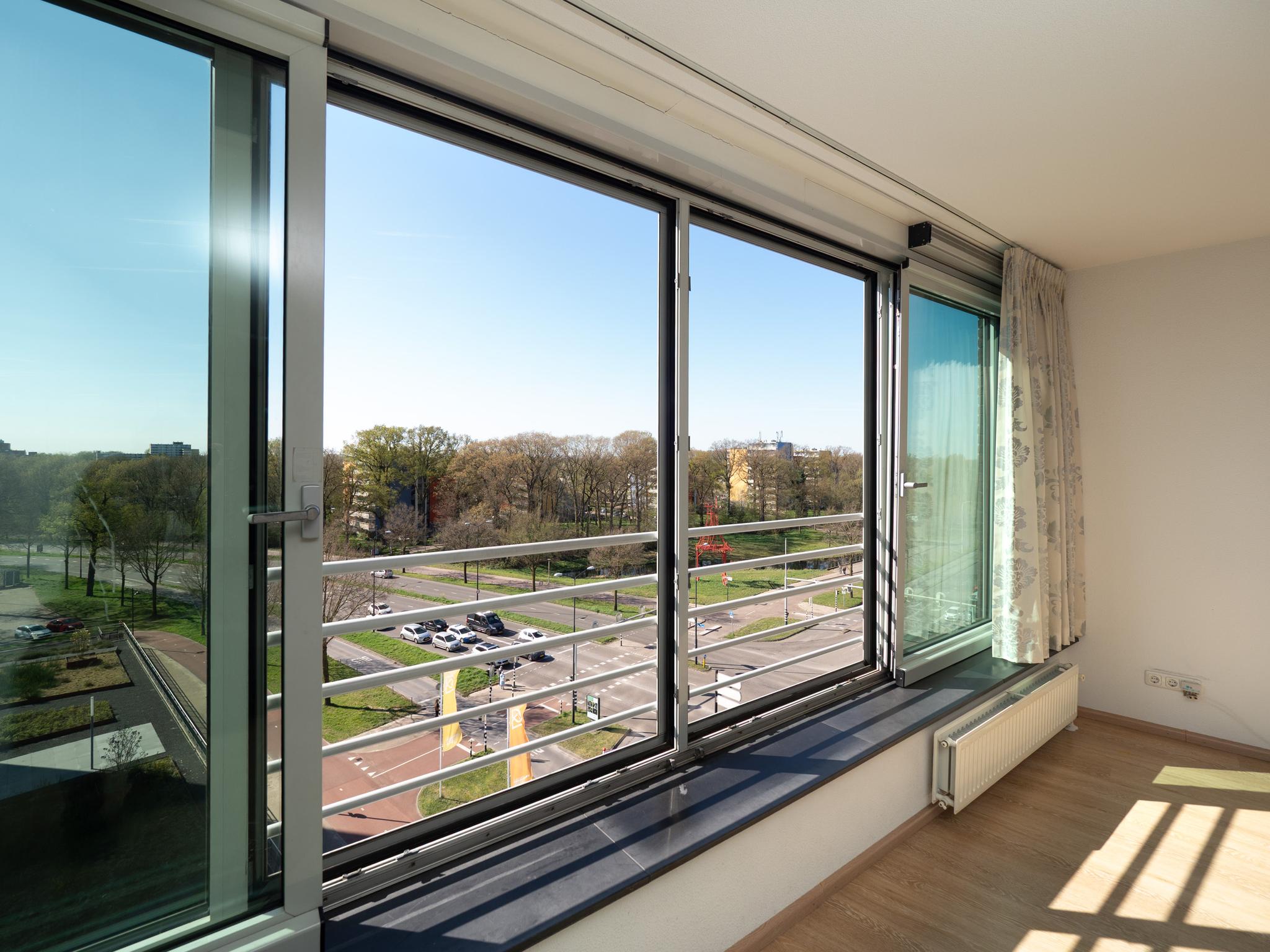 U ziet er echter niets van want u hebt een fantastisch en gevarieerd uitzicht over de stad en in de zomerdag een groen golvend landschap dat zich uitstrekt tot ver voorbij de Hatertse Vennen en recreatie park de Berendonck.