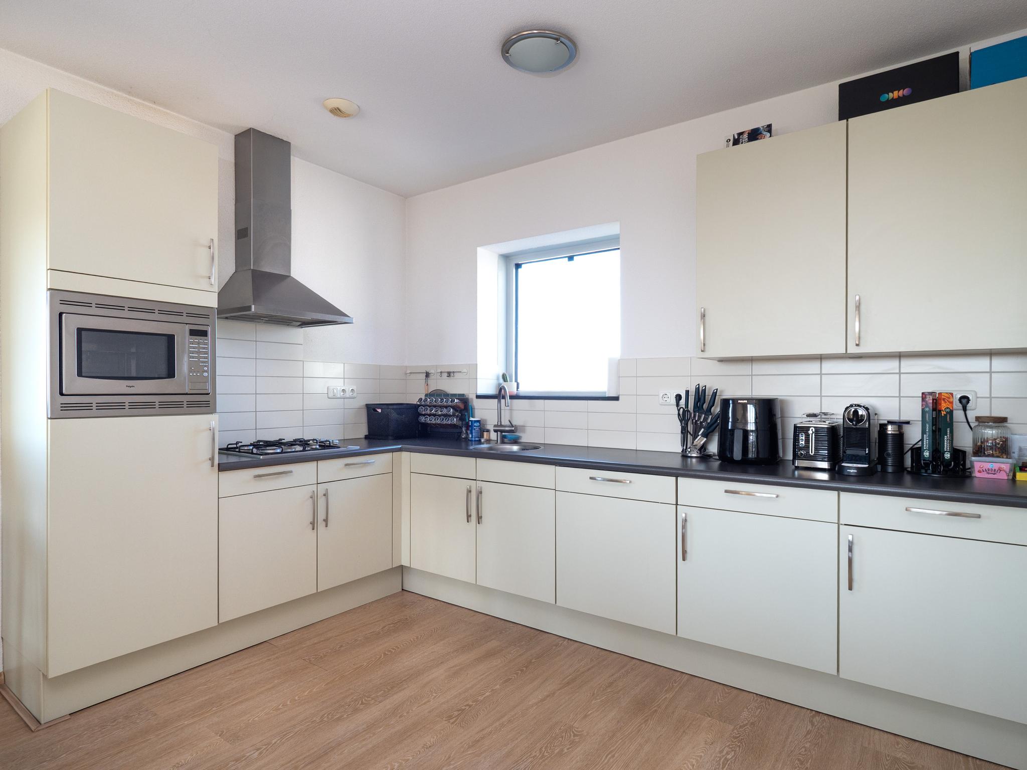 De keuken is voorzien van koelkast, vaatwasser, combi-oven, gaskookplaat en afzuigkap.