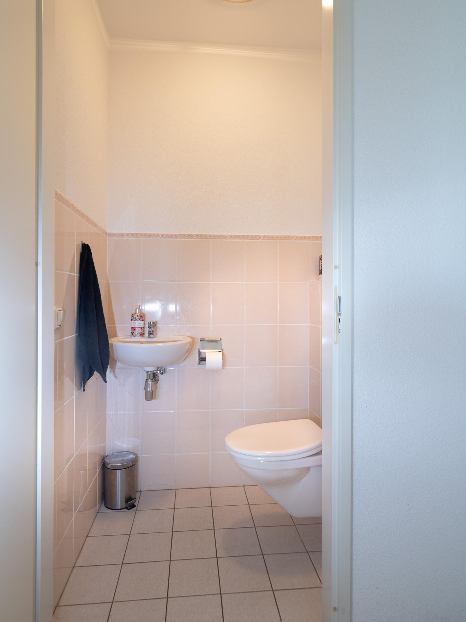 Separaat toilet met wandcloset en fonteintje.
