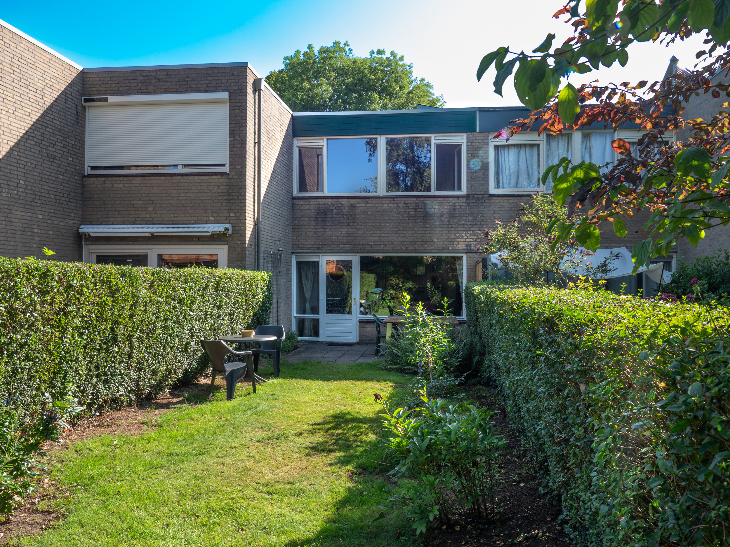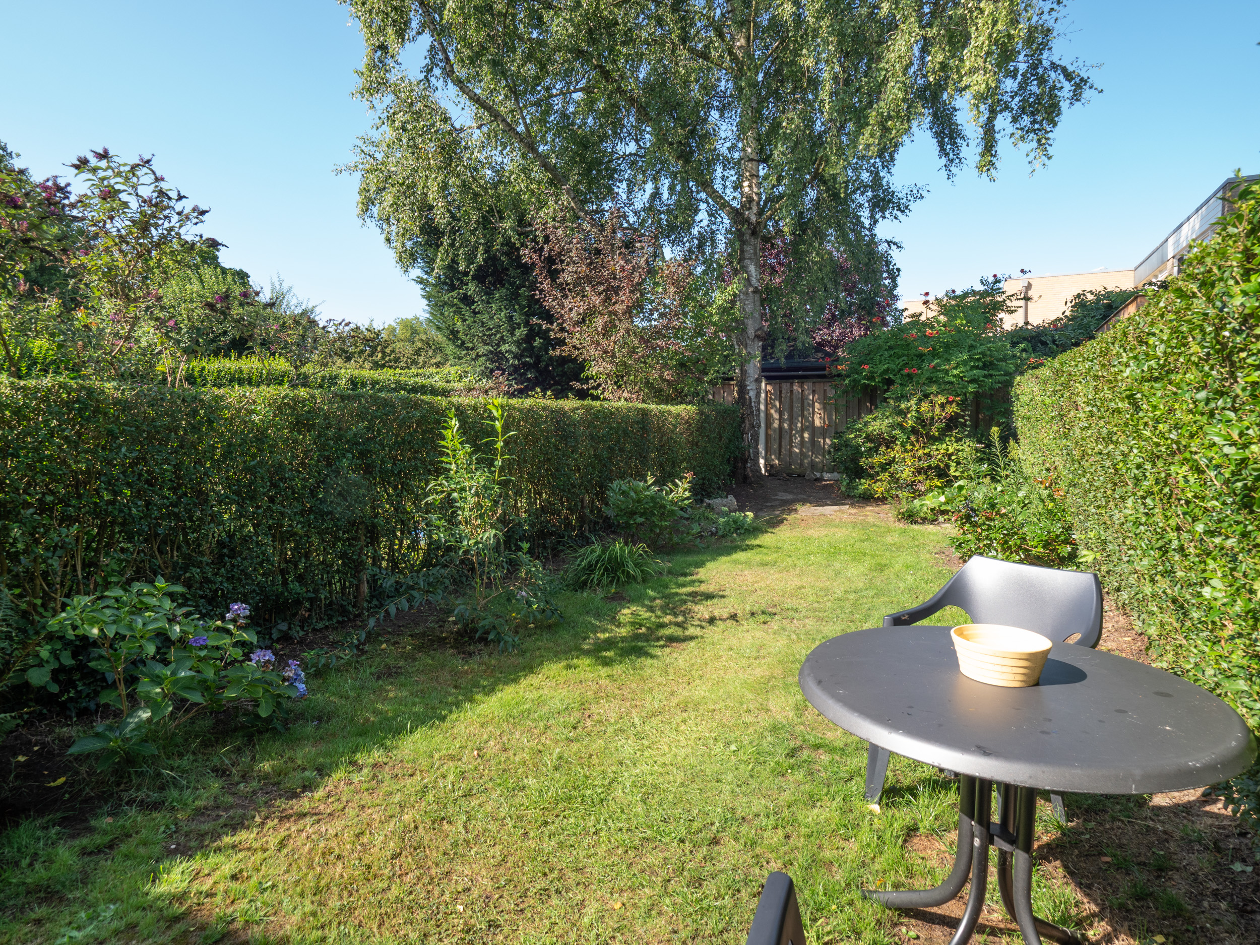 Verzorgde tuin met grasveld, plantenborders en terras op het zuid westen gelegen