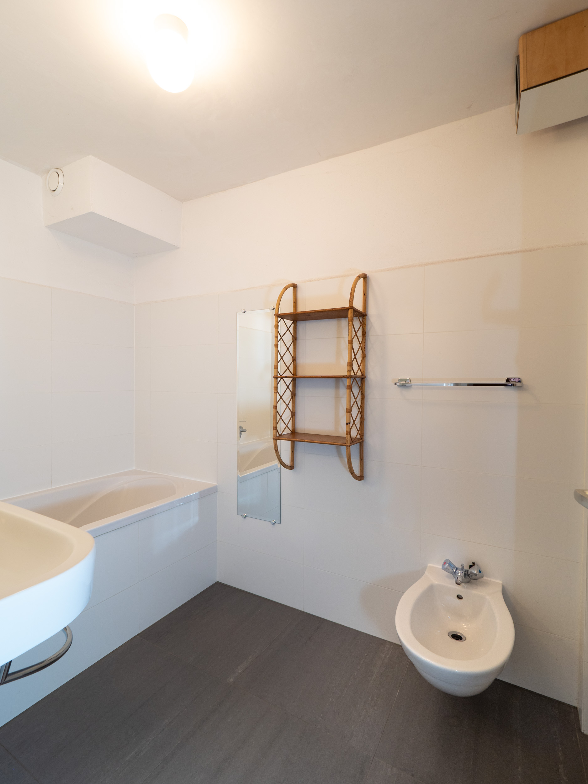 Badkamer met ligbad, wastafel en bidet op de verdieping.