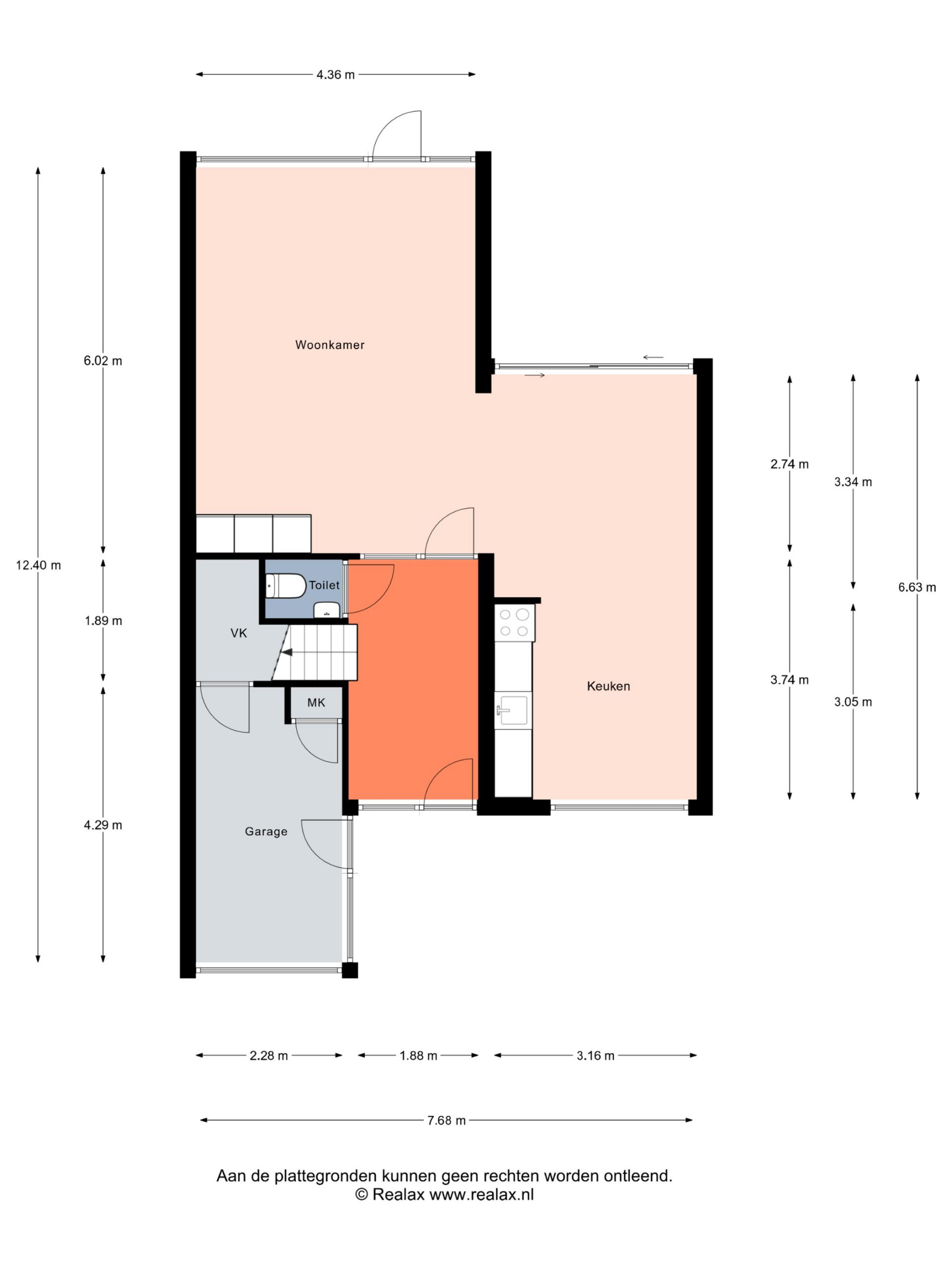 entree, met aangebouwde berging, ruime hal, toilet en trapopgang, Z-woonkamer met halfopen eetkeuken.