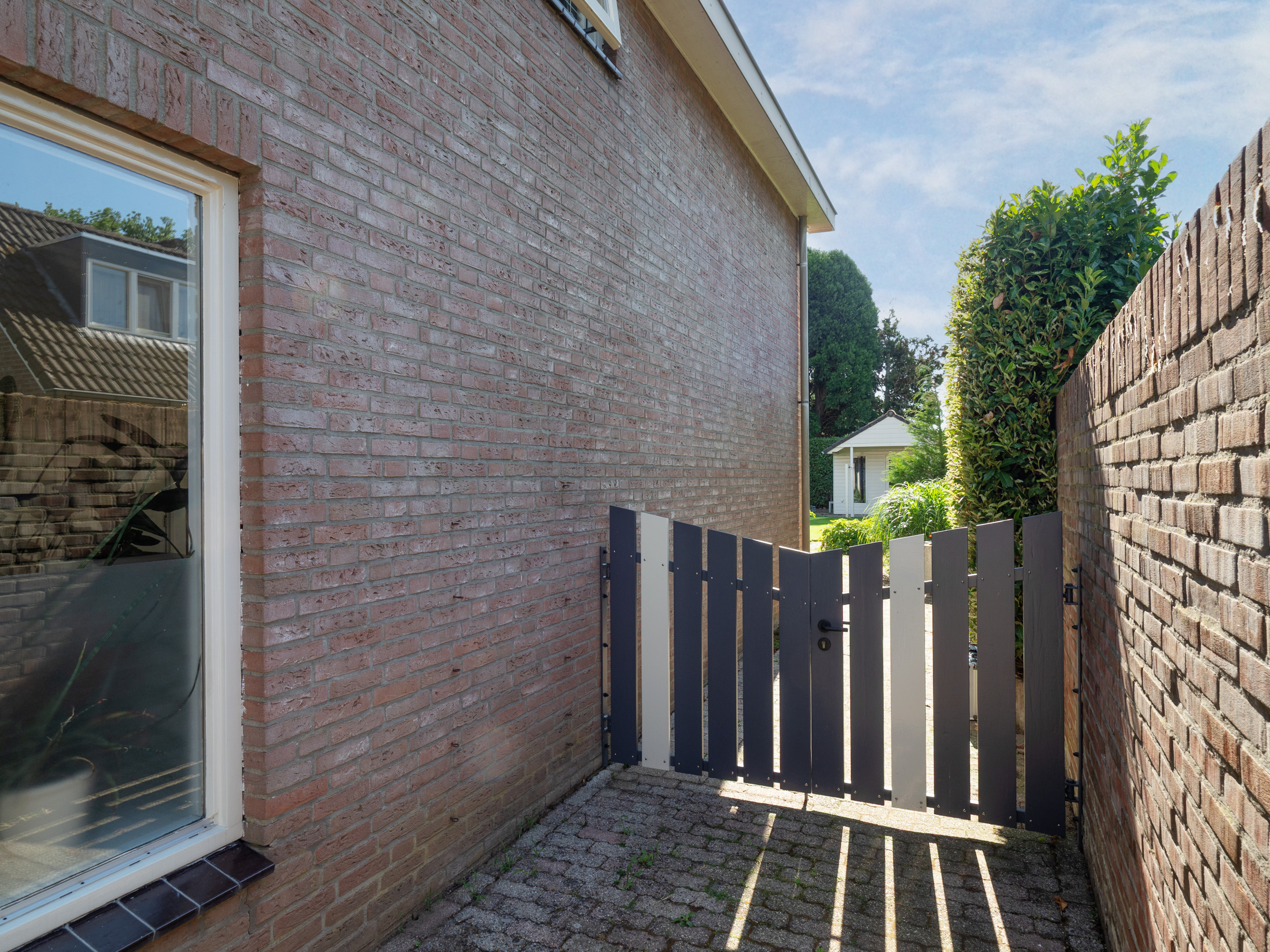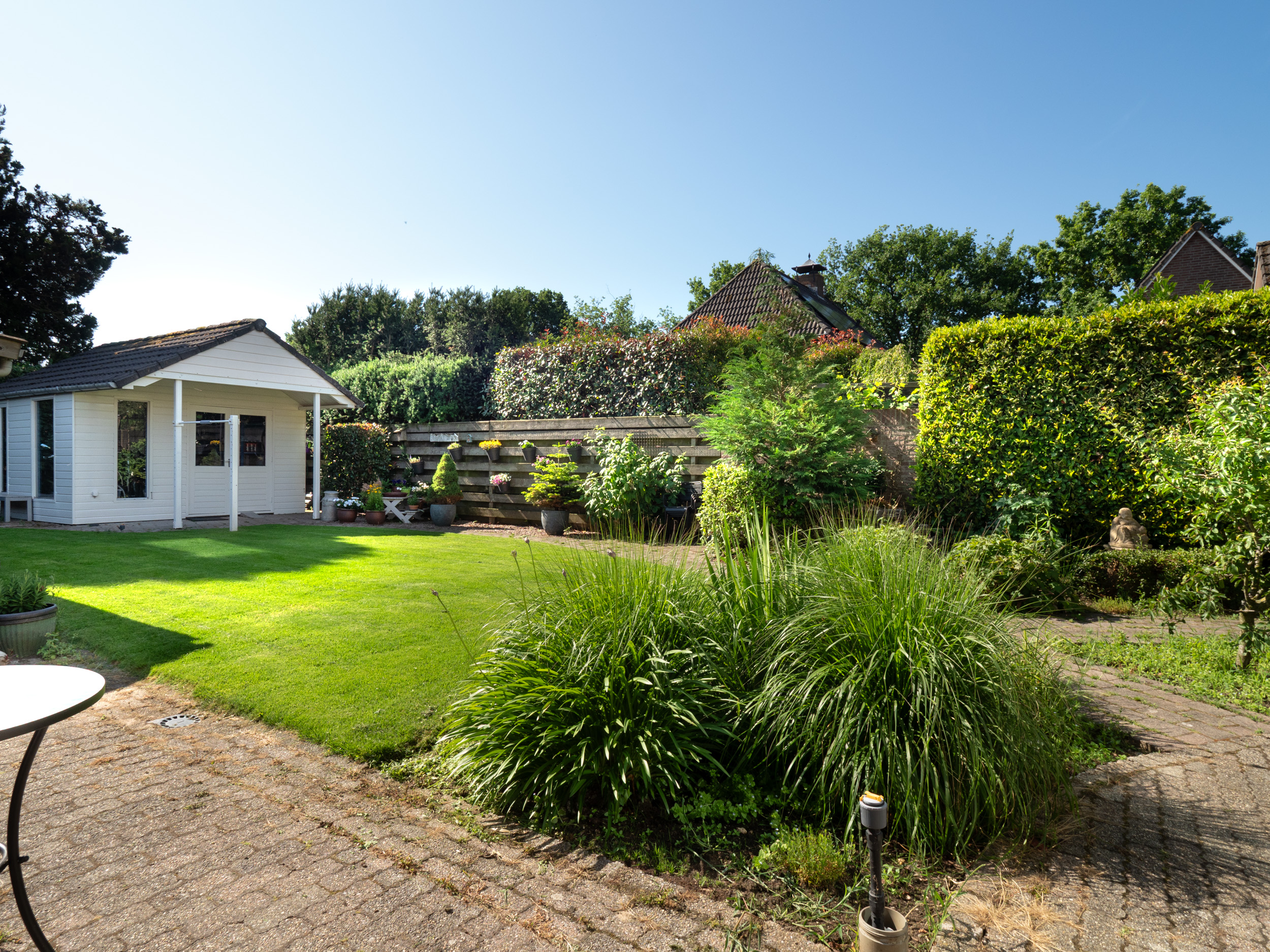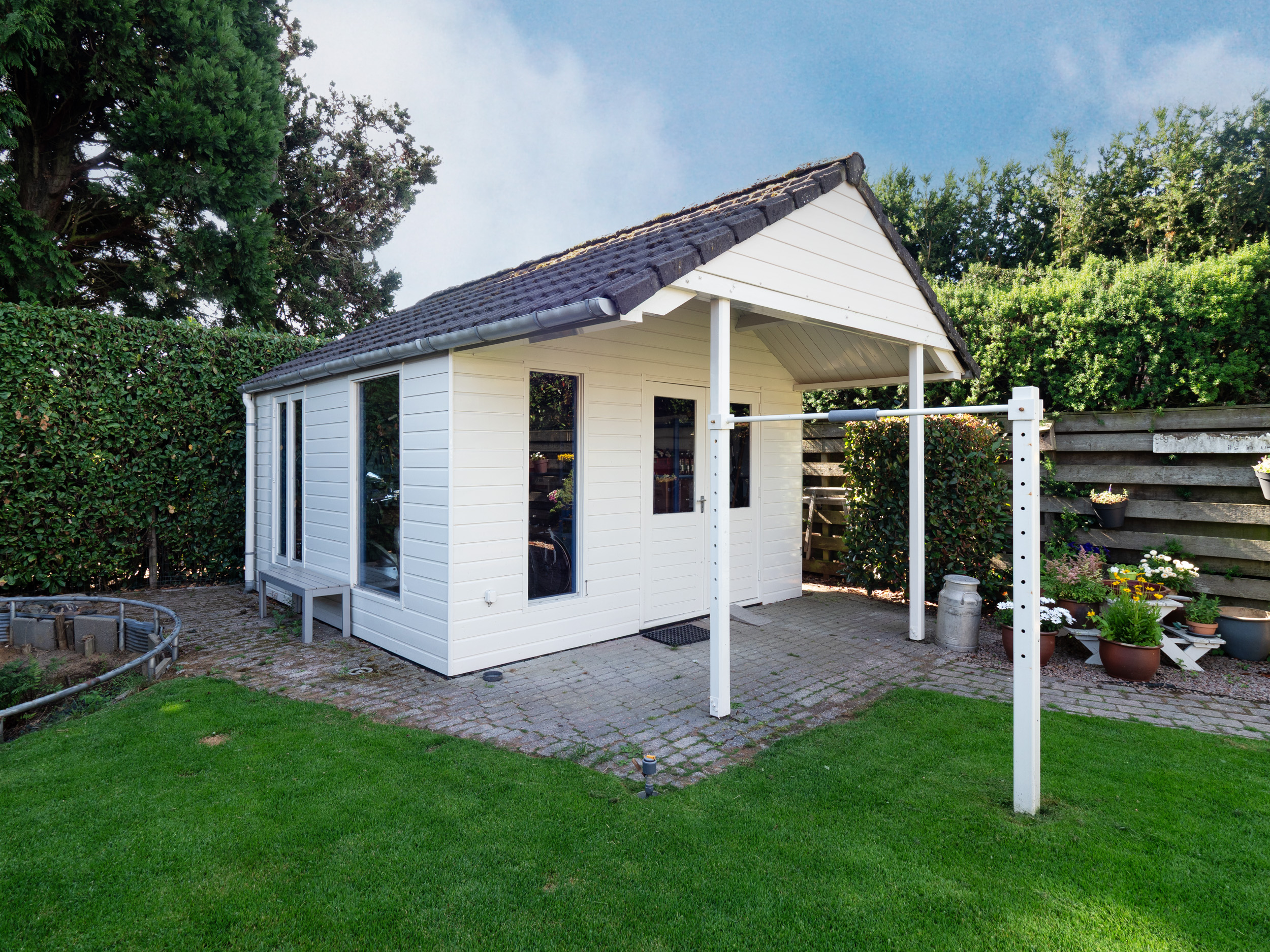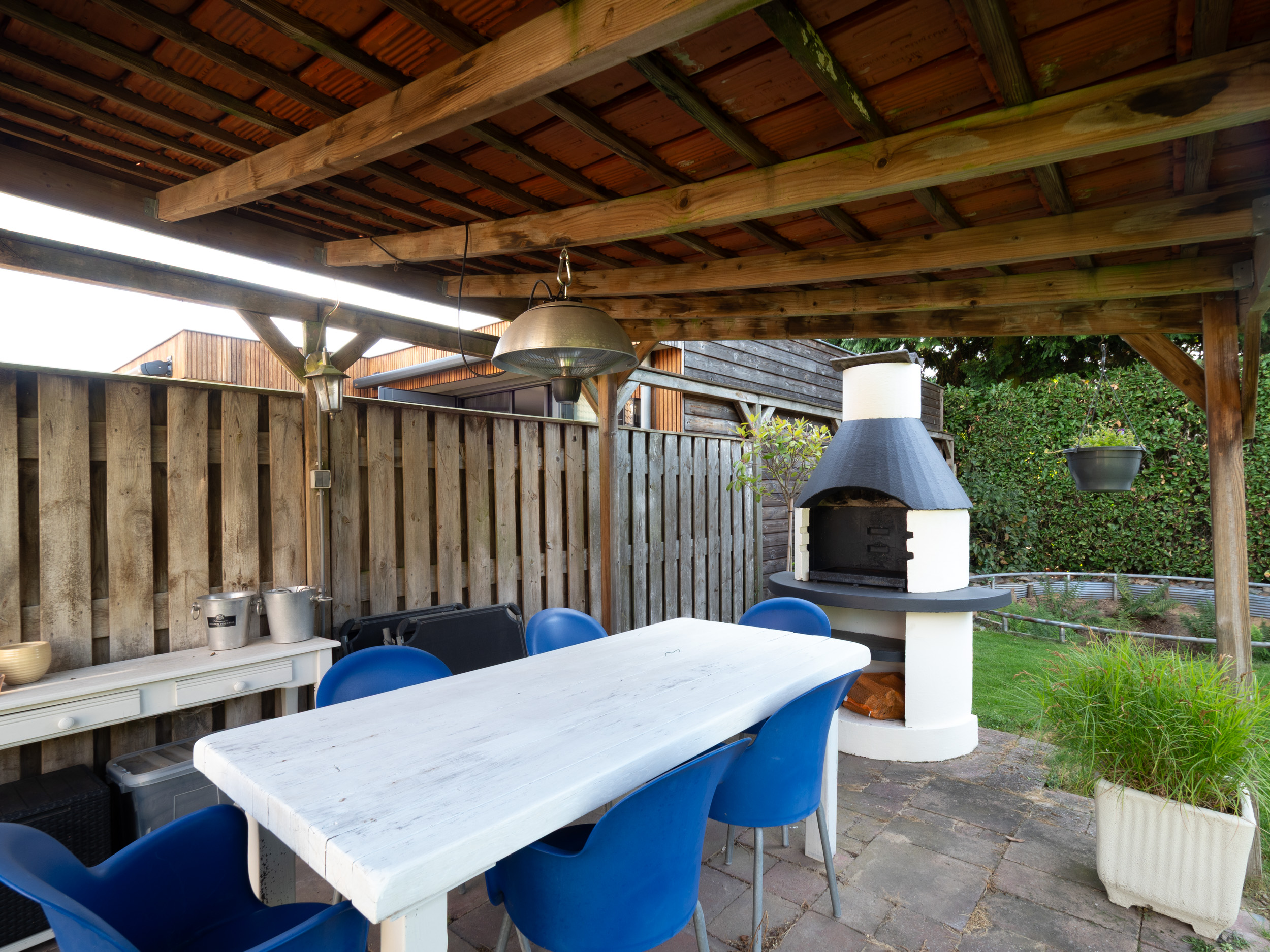 Er is een grote berging voor al het tuingereedschap en fietsen en een fijne plaats voor een eettafel onder de overkapping. In de tuin is een waterpuls en beregeningsinstallatie aanwezig.