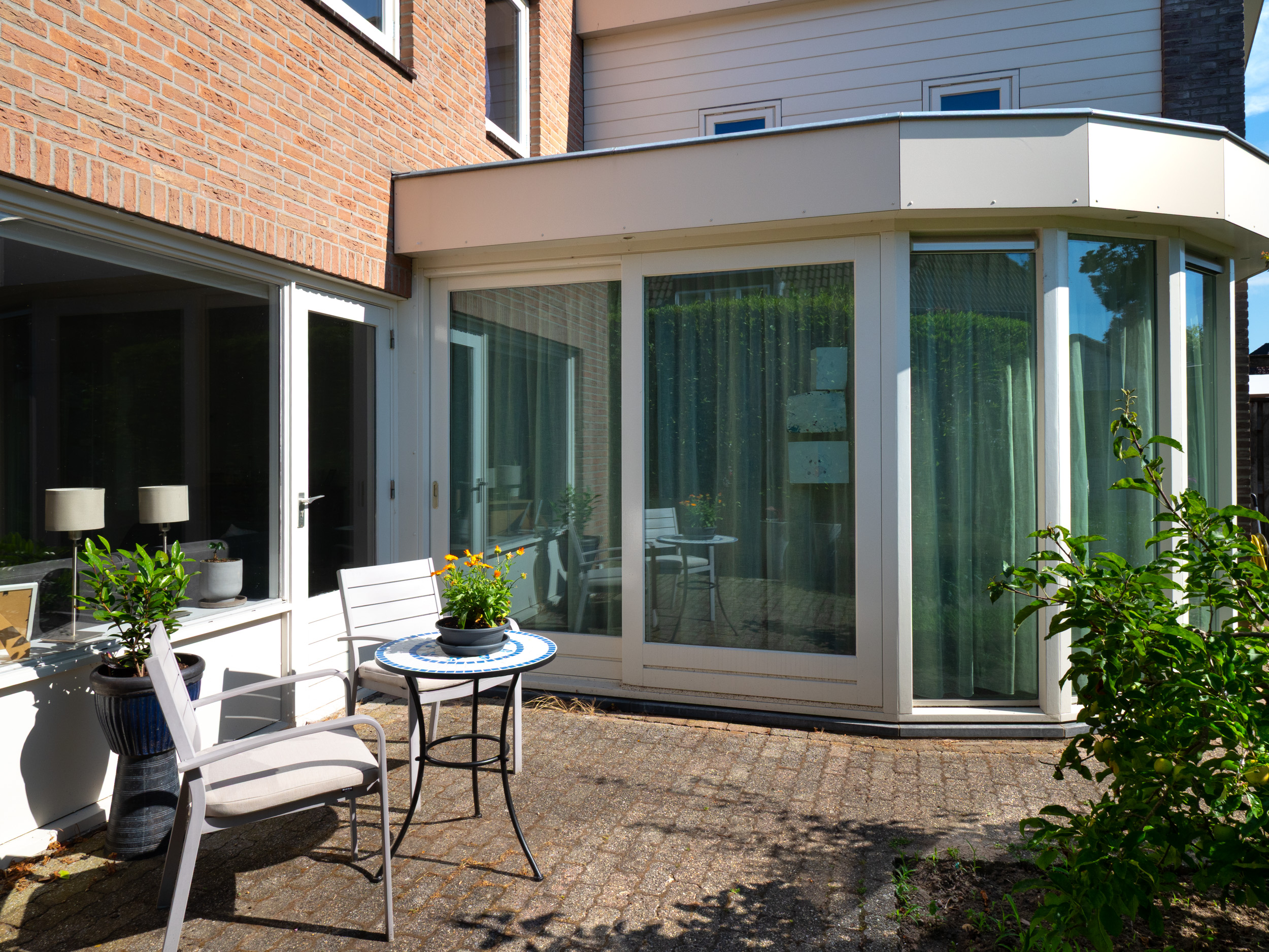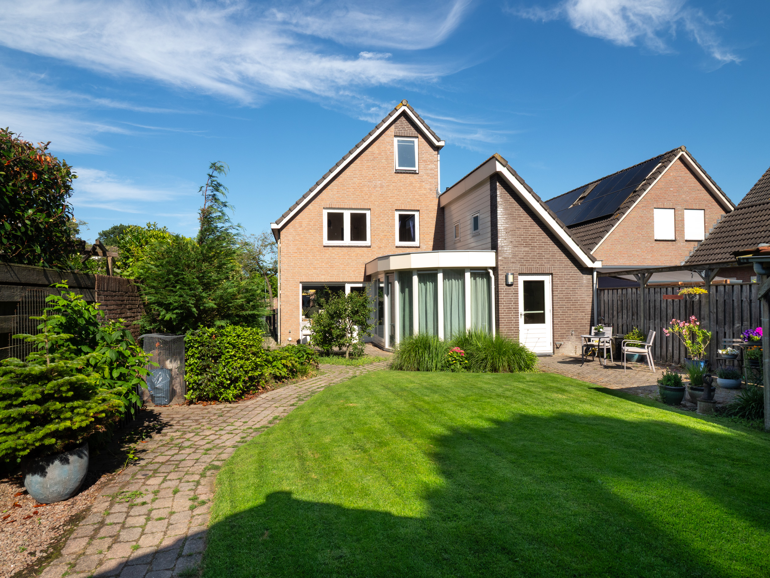 Verzorgde tuin met straatwerk, grasperk, plantenbordes en overkapping op het oosten gelegen.