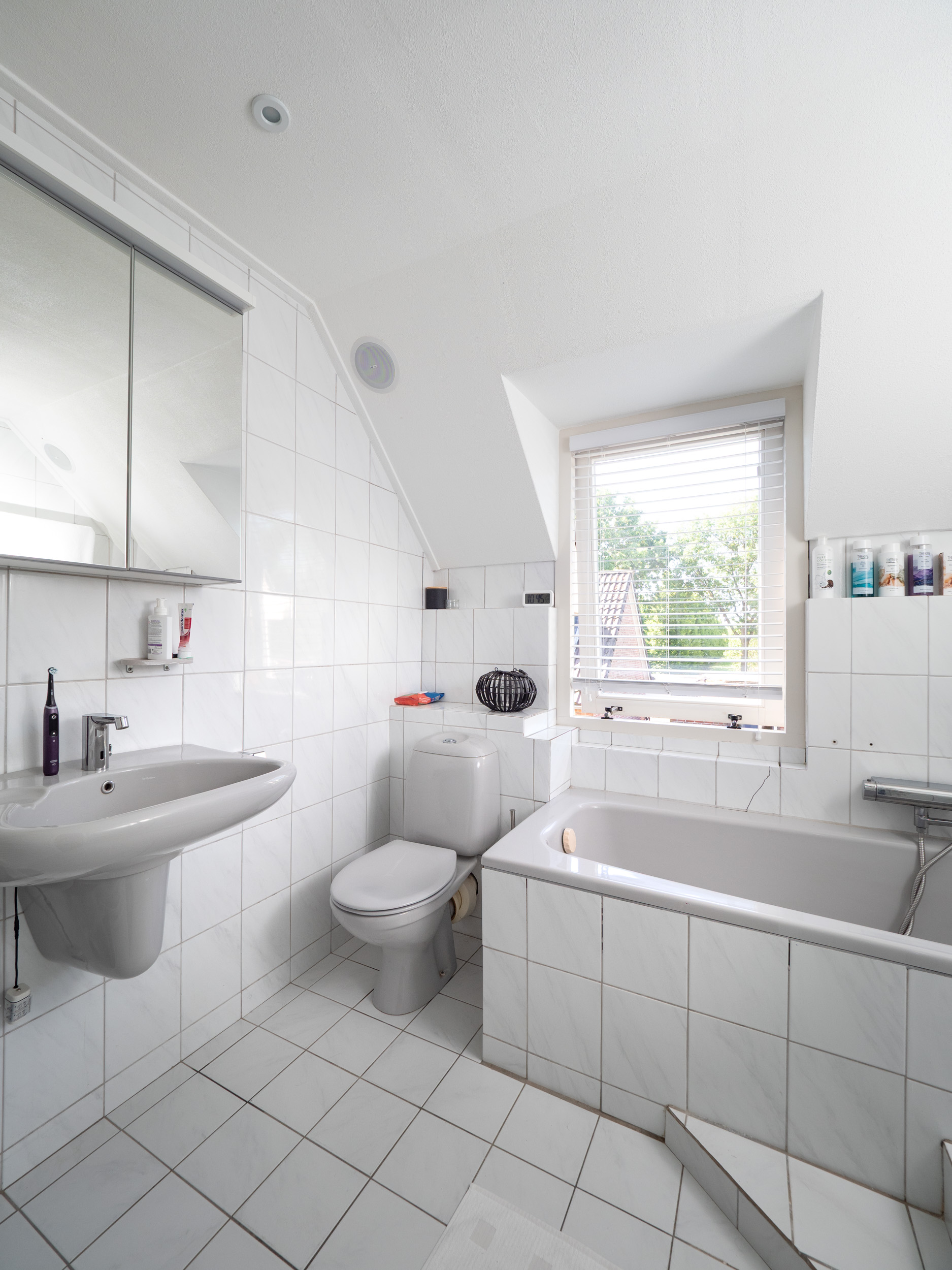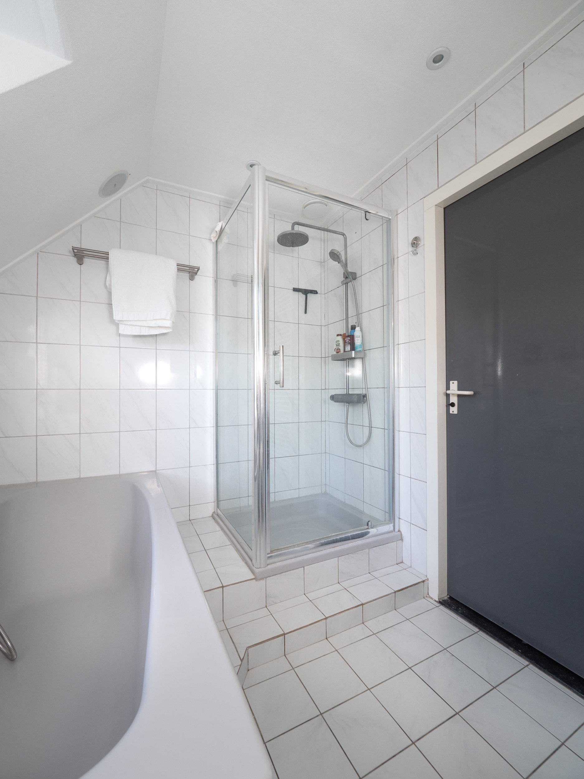 Badkamer met dakkapel en voorzien van ligbad, douche, wastafel en toilet.