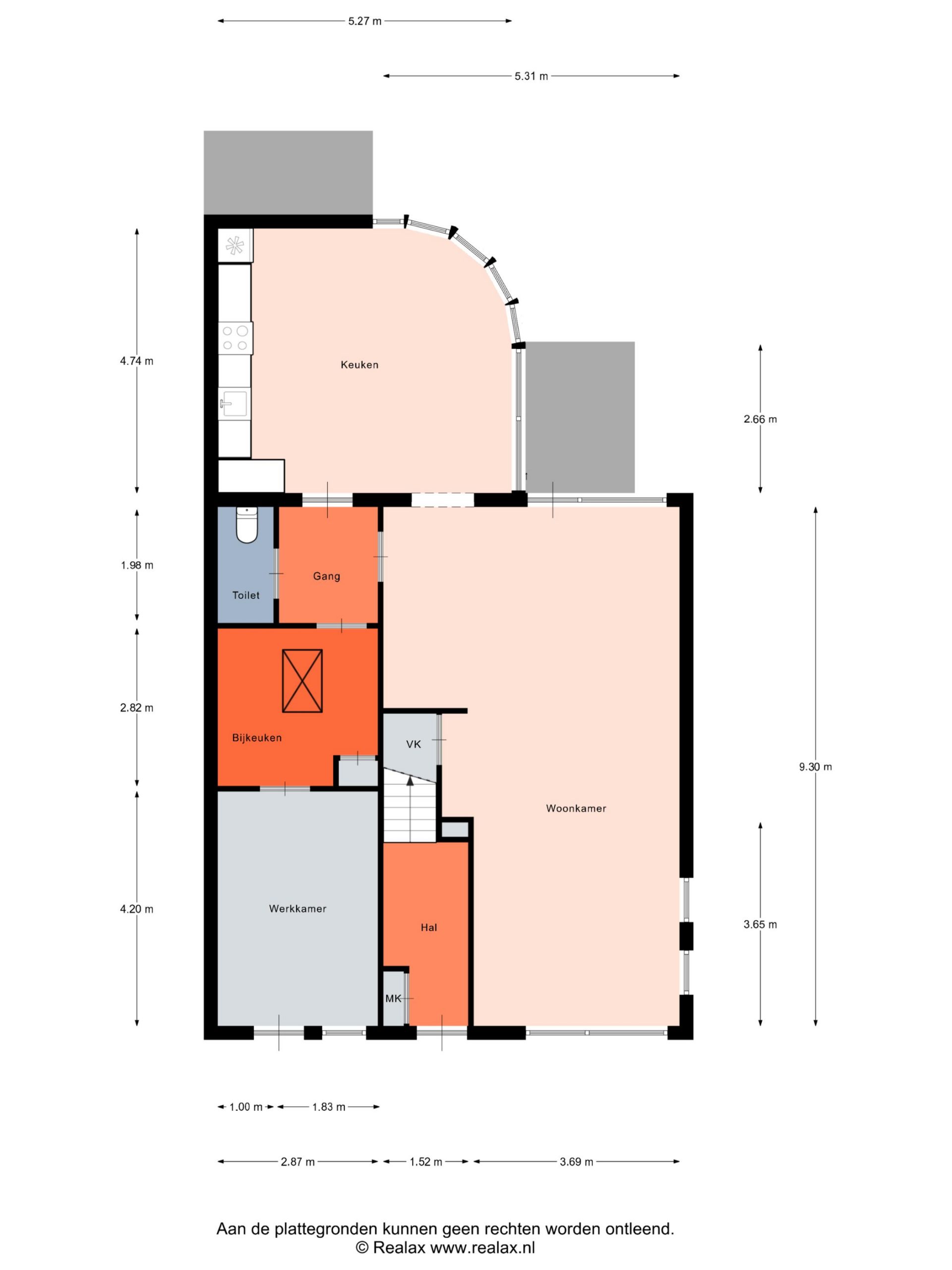 Entree, meterkast, royale woonkamer (44m2), eetkeuken met hoog plafond en schuifpui( 25m2), portaal met toilet, bijkeuken met aansluiting voor de wasmachine en vlizotrap naar bergzolder, praktijkruimte/werkkamer (12m2)met eigen toegang.